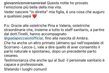 Alle parole di Giovanni, che ne ha approfittato per ringraziare anche tutti i medici e gli infermieri che si sono presi cura della compagna, sono seguite anche quelle di Giada che attraverso un’Instagram Story ha dato il benvenuto alla piccolina: “Buongiorno, la vita, l’amore, ben arrivata Ambra!”.