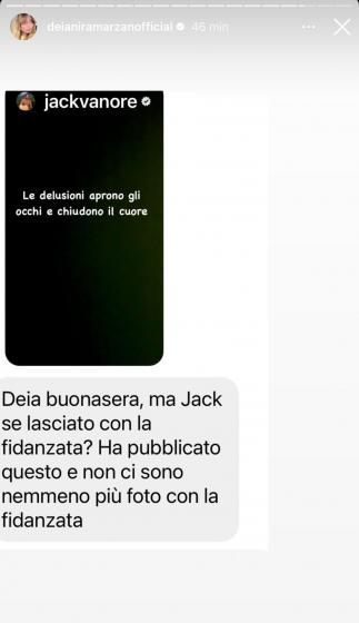 Nonostante al momento non ci siano state conferme da parte dei diretti interessati, una storia social condivisa dall’ex opinionista sul suo profilo Instagram ha messo in allarme i fan. Jack, infatti nelle sue storie ha scritto “Le delusioni aprono gli occhi e chiudono il cuore”, una frase che a molti ha fatto pensare si riferisse proprio alla sua situazione sentimentale.