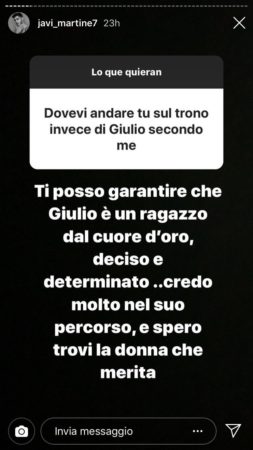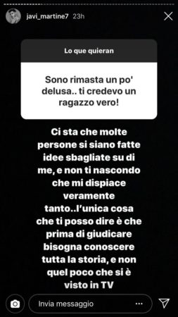Tornato sui social, Javier ha voluto spiegare meglio le sue ragioni, ed oltre a ribadire che a lui Sara interessava davvero e che non era assolutamente fidanzato né durante Temptation né durante le puntate del Trono Classico, ha anche svelato – con un’Instagram story poi prontamente rimossa – di aver cercato la tronista anche fuori dagli studi: