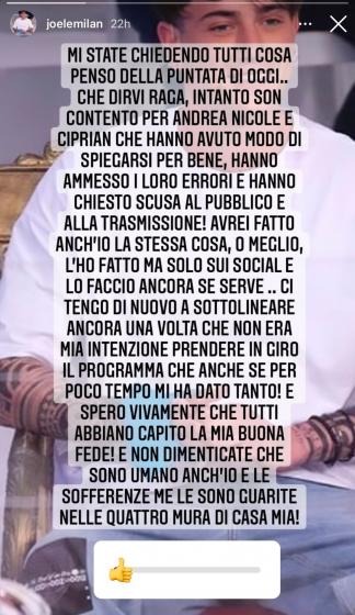 Sorpreso dall’ospitata dei due anche Joele Milan, che non ha esitato a lasciarsi andare in un lungo sfogo su Instagram.