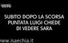 Il problema è lei, è sempre lei santo cielo. Colei che in esterna fa gli occhioni da gatta e in studio lo tratta con sufficienza, sminuendo qualsiasi gesto o parola che arriva da lui. E ha ragione Lorenzo, finché c’era da contenderselo con Nilufar Addati la Affi Fella si sperticava, ora che ha tra le mani il trofeo pare una bimba annoiata che vuole passare al prossimo giocattolo. Che non è Luigi, però, perché se non la vedo più così fomentata per il Riccardi poco cambia quando davanti a lei c’è Luigi.