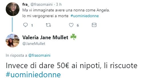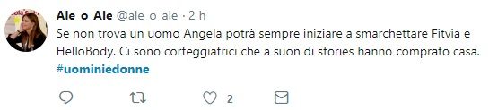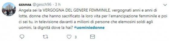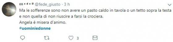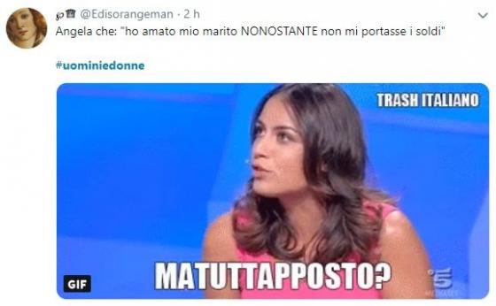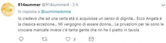 Una cosa, però, fatemela dire. Se nell’ottica della tv spazzatura Angela è PERFETTA, in quella umana decisamente meno. Che lei a 70anni voglia godersi i suoi soldi senza mantenere nessuno ci sta, ma mi sfugge perché qualcun altro dovrebbe mantenere lei, che gli abbracci li stoppa “perché è presto“, ma per la convivenza e le crociere no.