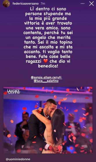 All’interno della trasmissione, la coppia formata da Luca e Soraia ha potuto conquistare parecchi consensi, tra cui quello di Federica Aversano. Quest’ultima era scesa a corteggiare Matteo Ranieri – compagno di trono di Luca – che poi però aveva scelto Veronica Cardone.