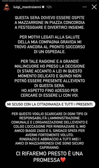 Ieri sera Luigi Mastroianni avrebbe dovuto esibirsi a Mazzarone, in Sicilia. Purtroppo a poche ore dall’evento, l’ex tronista di Uomini e Donne ha dovuto annullare la sua presenza, in quanto la sua compagna in dolce attesa è stata portata al pronto soccorso.