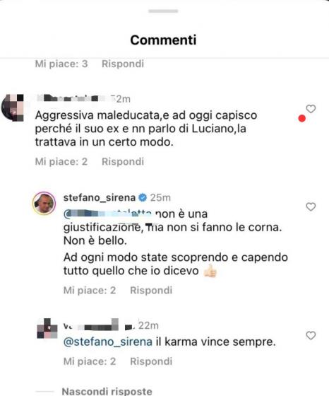 Sotto a uno dei post contro la tronista, si è palesato Stefano Sirena, storico ex della Carriero, l’uomo con cui aveva partecipato qualche anno fa al reality delle tentazioni. La loro relazione, come ricordiamo, terminò dopo un accesissimo falò di confronto. Successivamente Manuela si legò al suo ex tentatore Luciano Punzo. Storia poi terminata lo scorso aprile.