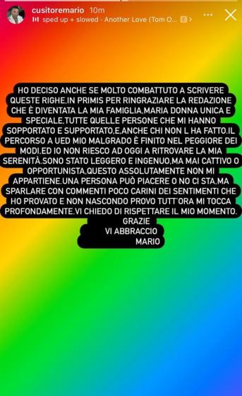 Sembra quindi che Mario non riesca a ritrovare la serenità, tanto da chiedere ai suoi followers di rispettare questo momento.