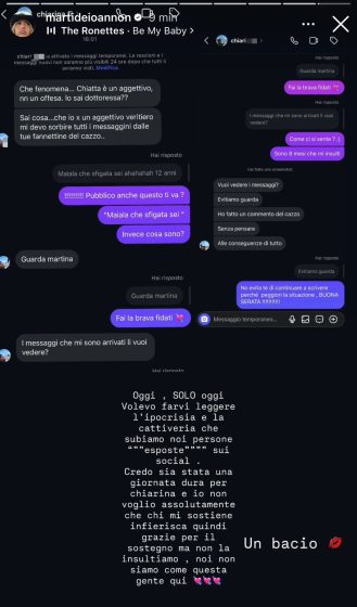 Oggi, SOLO oggi. Volevo farvi leggere l’ipocrisia e la cattiveria che subiamo noi persone “esposte” sui social. Credo sia stata una giornata dura per chiarina e io non voglio assolutamente che chi mi sostiene infierisca quindi grazie per il sostegno ma non la insultiamo, noi non siamo come questa gente qui.