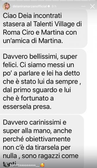 Ciao Deia incontrati stasera al Talenti Village di Roma Ciro e Martina con un’amica di Martina. Davvero bellissimi, super felici. Ci siamo messi un po’ a parlare e lei ha detto che è stato lui da sempre, dal primo sguardo e lui che è fortunato a essersela presa. Davvero carinissimi e super alla mano, anche perché obiettivamente non c’è da tirarsela per nulla, sono ragazzi come tutti.