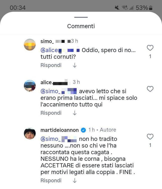 Non ho tradito nessuno… non so chi ve l’ha raccontata questa cag***. Nessuno ha le corna. Bisogna accettare di essere stati lasciati per motivi legati alla coppia. Fine.