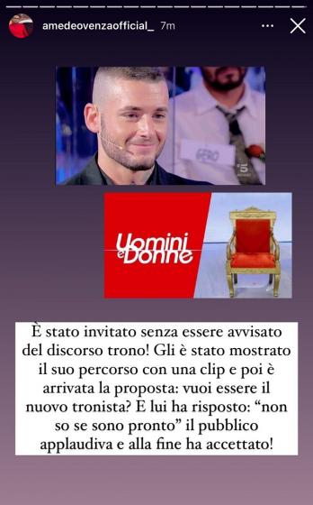 E’ stato invitato senza essere avvisato del discorso del troni! Gli è stato mostrato il suo percorso con una clip e poi è arrivata la proposta: vuoi essere il nuovo tronista? E lui ha risposto: “non so se sono pronto”. Il pubblico applaudiva e alla fine ha accettato.