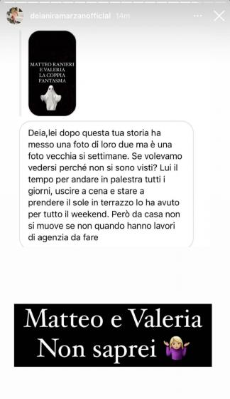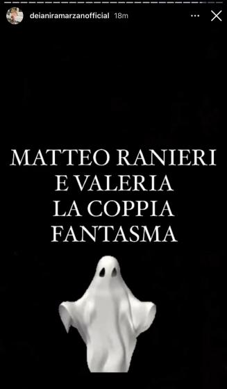 Tuttavia da qualche giorno alcuni fan hanno fatto notare l’assenza sui loro profili social di post e storie che immortalino momenti di normale quotidianità. Le foto di coppia sono tratte da book o servizi fotografici. Matteo e Valeria sono poco social? Non sembrerebbe così, in quanto non è raro vedere Matteo Ranieri postare foto durante i suoi allenamenti in palestra, mentre è in compagnia di amici o con il suo cagnolino. Secondo i loro fan la coppia si vedrebbe molto poco e quando succede è solo per motivi di lavoro. Questa mattina anche l’influencer Deianira Marzano ha insinuato un dubbio in merito, pubblicando una storia Instagram sui due, definendoli ” la coppia fantasma”.