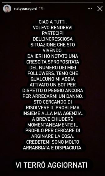 Ciao a tutti. Volevo rendervi partecipi dell’incresciosa situazione che sto vivendo. Da ieri ho notato una crescita spropositata del numero dei miei followers, temo che qualcuno mi abbia attivato un bot per dispetto o, peggio ancora, per arrecarmi un danno. Sto cercando di risolvere il problema insieme alla mia agenzia. A breve chiuderò momentaneamente il profilo per cercare di arginare la cosa. Credetemi, sono molto arrabbiata e dispiaciuta. Vi terrò aggiornati.
