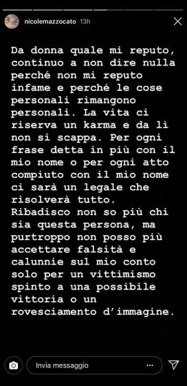 “Da donna quale mi reputo contino a non dire nulla perché non mi reputo infame e perché le cose personali rimangono personali – ha scritto Nicole – La vita ci riserva il karma e da lì non si scappa. Per ogni frase detta in più con il mio nome o per ogni atto compiuto con il mio nome ci sarà un legale che risolverà tutto. Ribadisco non so più chi sia questa persona, ma purtroppo non posso più accettare falsità e calunnie sul mio conto solo per un vittimismo spinto a una possibile vittoria o un rovesciamento d’immagine!“
