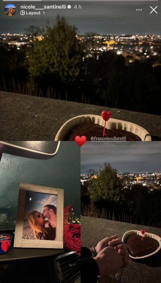 In un’immagine si nota la vista notturna sulla città, luci soffuse e in primo piano un dolce al cioccolato con un cuore, in un’altra c’è la foto incorniciata di Nicole Santinelli mentre dà un dolce bacio al suo nuovo fidanzato, poggiata insieme a un mazzo di fiori sul cruscotto della macchina. Nella terza si notano due mani intrecciate davanti al panorama, con una torta a forma di cuore sul muretto.