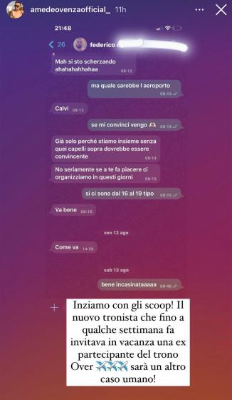 Pochi minuti dopo l’annuncio ufficiale però, sono arrivate le prime segnalazioni riguardanti Federico Dainese. Stando a quanto trapelato da Amedeo Venza sul suo profilo Instagram, sembrerebbe infatti che il nuovo tronista si stia sentendo con un’ex dama del trono over: