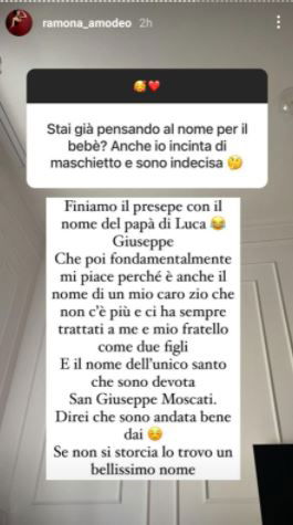 Rispondendo ad alcune curiosità dei suoi follower, la Amodeo ha rivelato che chiamerà il figlio Giuseppe, come il papà di suo marito Luca: