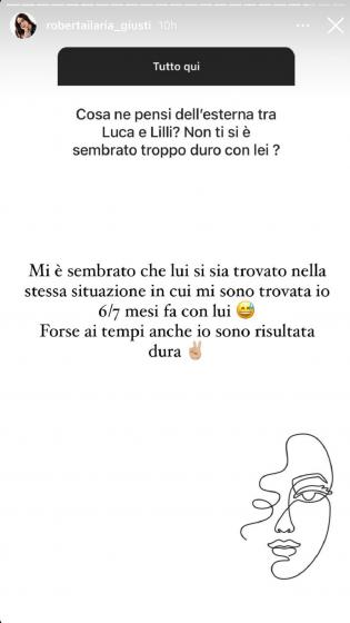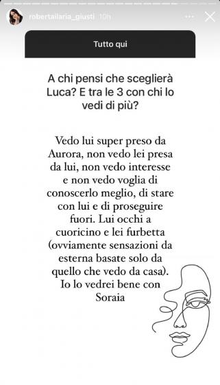 A tal proposito, l’ex tronista Roberta Giusti si è sbilanciata con qualche dichiarazione nel corso di una chiacchierata con i suoi follower su Instagram. Come ricordiamo, Luca è arrivato all’interno del dating show di Maria De Filippi come corteggiatore proprio di Roberta, la quale poi gli ha preferito Samuele Carniani, con cui è felicemente fidanzata.