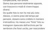 Da quelle foto io non ho mai più visto Alessio, ci siamo presi del tempo per pensare, stasera sono crollata in maniera irretroattiva. Ho messo una “finta” foto su Instagram, ripescata dall’archivio, per far sembrare che fossi uscita, per nascondere l’ennesima sera a casa, per cercare di “difendermi”, per fare quella che in amore fugge, per farsi amare. A 30 anni è troppo patetico. Almeno a me stessa devo ammetterlo. Mi è stato chiesto di aspettare fino a lunedì, ma io non resistevo già dopo due ore. Non riesco a rimandare un confronto così importante, per così tanto tempo.