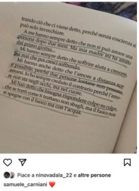 I ragazzi, fuori dagli studi, dimostrano di aver spesso un pensiero per la loro tronista del cuore. Alcune mosse social delle ultime ore hanno infatti attirato l’attenzione dei fan. Samuele ha condiviso prima uno stralcio di un film d’amore, poi ha postato alcune frasi di un libro che per molti sarebbero chiaramente riferite alla sua situazione con Roberta: