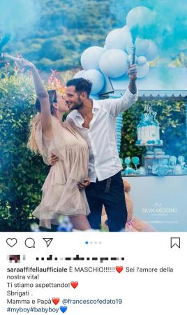 Sara e Francesco sapevano il sesso del loro primogenito già da qualche settimana, ma hanno voluto aspettare qualche visita di controllo in più per dare la lieta notizia, e soprattutto non hanno voluto farlo in maniera banale. Ieri pomeriggio, infatti, l’ex tronista e il calciatore hanno organizzato un colorato baby shower con cui hanno annunciato ad amici e parenti che ad allietare le loro giornate arriverà presto un bel maschietto.