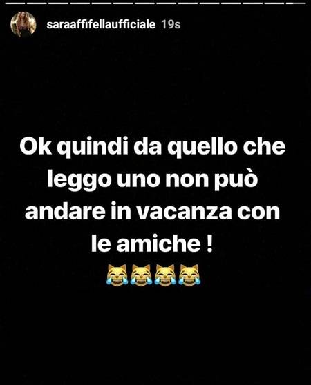 Questa freddezza (anche) social tra i Mastrifella ha fatto subito ipotizzare una crisi ai numerosi seguaci, ma entrambi non hanno minimamente provveduto a smentire o confermare la cosa, segno – secondo alcuni – che l’ipotesi non sia poi così remota e impossibile. Nelle ultime ore, subissata dalle critiche, proprio Sara è comparsa su Instagram con una storia immediatamente cancellata, in cui si difendeva alle accuse di chi non ha concepito di buon occhio il suo viaggio con le amiche piuttosto che col fidanzato: