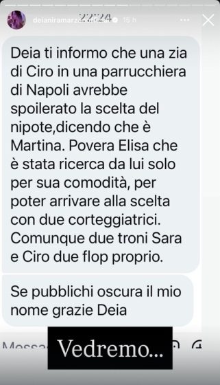 Deia ti informo che una zia di Ciro in una parrucchiera di Napoli avrebbe spoilerato la scelta del nipote, dicendo che è Martina. Povera Elisa che è stata ricercata da lui solo per sua comodità, per poter arrivare alla scelta con due corteggiatrici.