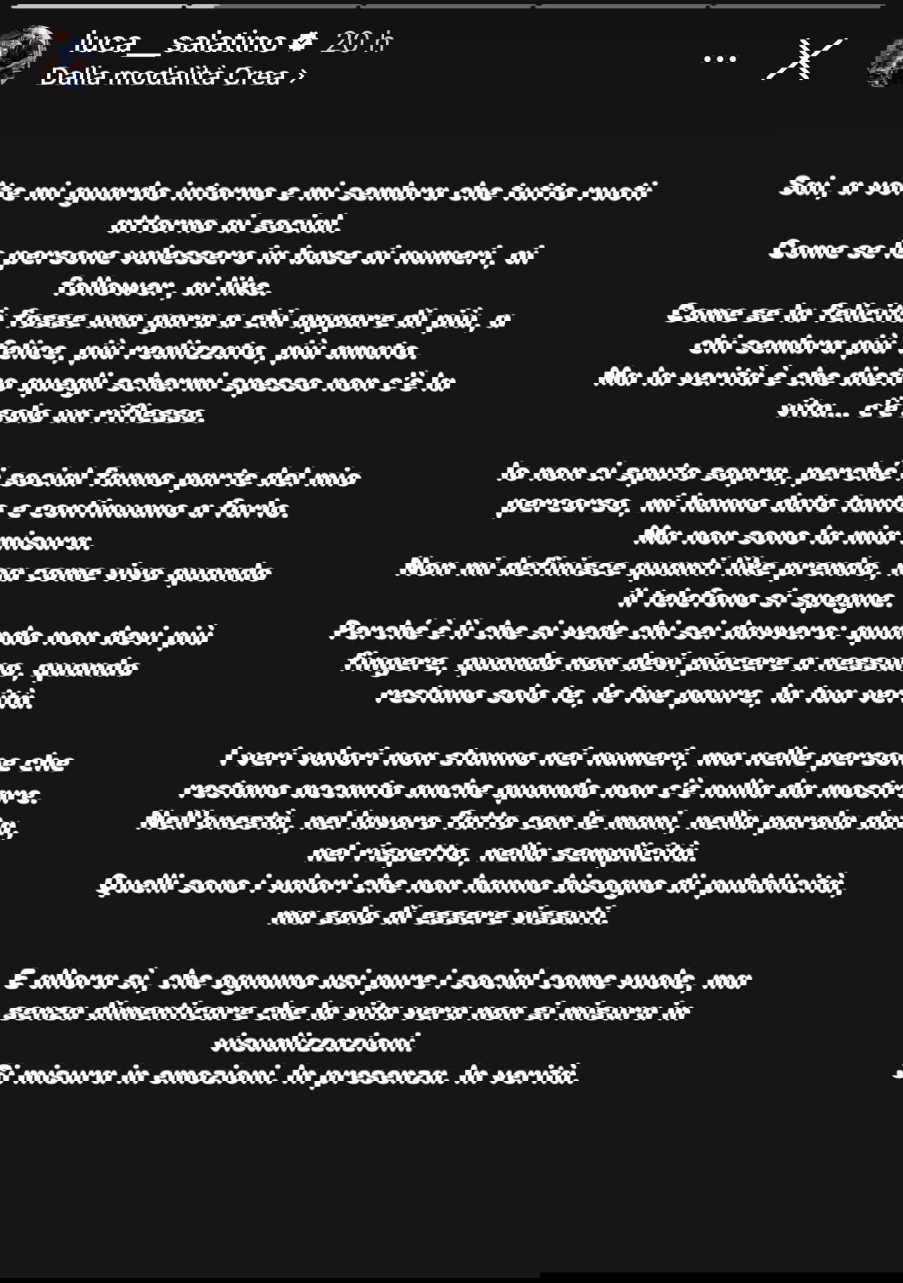 Io non ci sputo sopra, perché i social fanno parte del mio percorso, mi hanno dato tanto e continuano a farlo. Ma non sono la mia misura. Non mi definisce quanti like prendo, ma come vivo quando il telefono si spegne. Perché è li che si vede chi sei davvero: quando non devi più fingere, quando non devi piacere a nessuno, quando restano solo te, le tue paure, la tua verità.