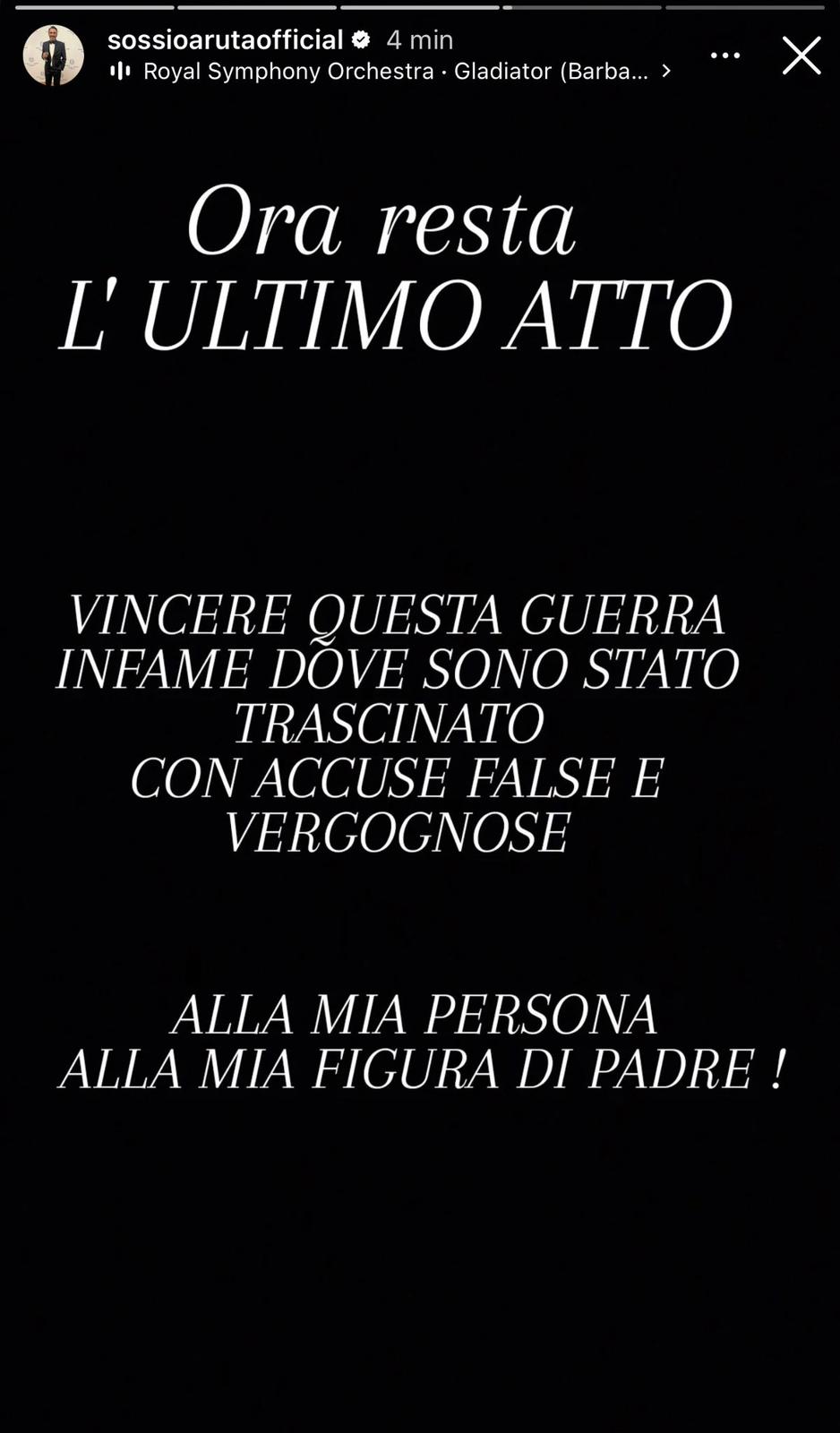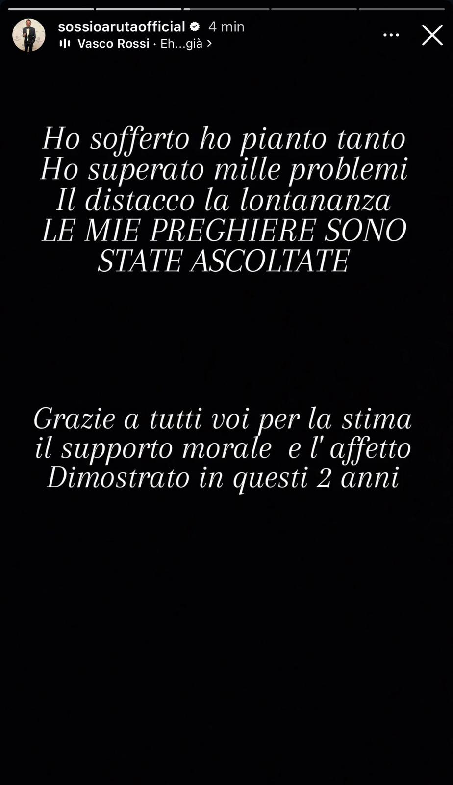 Ho sofferto ho pianto tanto. Ho superato mille problemi. Il distacco la lontananza. LE MIE PREGHIERE SONO STATE ASCOLTATE. Grazie a tutti voi per la stima il supporto morale e l’affetto Dimostrato in questi 2 anni. Ora resta l’ultimo atto. Vincere questa guerra infame dove sono stato trascinato con accuse false e vergognose.