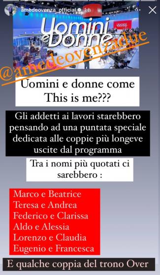 Stando a quanto riportato da Amedeo Venza, infatti, prossimamente potremo vedere su Canale 5 un nuovo show, al cui centro ci saranno alcune delle coppie più amate che si sono formate proprio all’interno del dating show e che fuori hanno proseguito la loro relazione, costruendo in molti casi una famiglia.