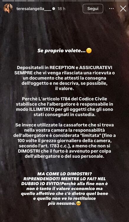 Ragazze, eccomi qua allora vi racconto come è successa la dinamica perché voglio che non succeda a nessun altro. Io sono stata così male, ma così male vi giuro, non avevo detto niente nemmeno alla mia famiglia e infatti l’ha fatto Andrea al posto mio. Io praticamente ero in questa struttura, ora anche per rispetto del lavoro dei carabinieri, non vorrei aggiungere troppo però ci tenevo tanto a dirvi di non lasciare le cose nelle cassaforti che trovate nelle camere degli hotel. Perché quello che è successo a me, potrebbe succedere a qualsiasi altra persona. Io sono stata sicuramente anche molto fortunata perché qualcuno si è passato una mano sopra il cuore e dopo circa 2 mesi me l’ha fatto trovare.
