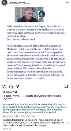 Nei giorni scorsi, nel corso di un’intervista, Giorgio Manetti, ex cavaliere di Uomini e Donne, ha definito la storica opinionista della trasmissione di Canale 5 Tina Cipollari “una bulla”, tirando anche in ballo il repulisti attuato da Pier Silvio Berlusconi in quel di Mediaset: