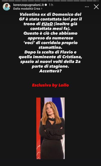 Valentina ex di Domenico del GF è stata contattata ieri per il trono di UeD (inoltre già contattata mesi fa). Questo è ciò che abbiamo appreso da numerose voci di corridoio proprio stamattina. Dopo la scelta di Flavio e quella imminente di Cristiana, spazio ai nuovi volti della 2a parte di stagione. Accetterà?