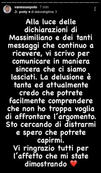Vanessa interviene sui social dopo che Massimiliano ha ufficializzato la loro rottura