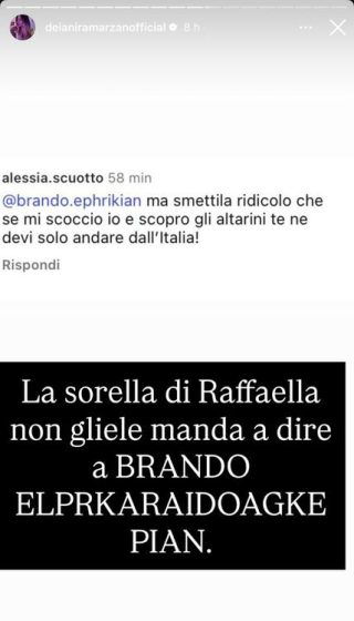 La risposta di Brando non è passata inosservata e ha provocato l’intervento della sorella di Raffaella, Alessia Scuotto, che ha commentato: