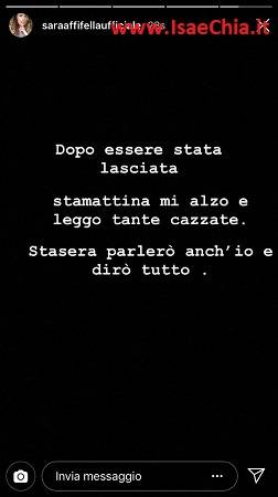 Ciao a tutti, mi avete mandato tremila messaggi in direct su Sara. Vi voglio dire una cosa, senza che stiamo a polemizzare niente. Sono stata accusata di tante cose all’epoca, ma premetto che io purtroppo ho un carattere che quando dico le cose le dico in un modo un po’ sbagliato, mia mamma me lo dice sempre. Quando c’è stato quel fatto, l’ho detto in un modo un po’ sbagliato, ma solo perché c’ero rimasta male di determinate cose, che non sto a ripetere. La mia opinione conta zero, mi avete scritto questo, io vi ringrazio per le scuse, perché alcuni di voi mi hanno minacciato all’epoca, pace fatta. Questo è, spero che lei trovi il suo cammino e tutto l’amore che ha perso. Forse la rivedremo con Nicola, chissà… Voi mi dovete 100 euro…