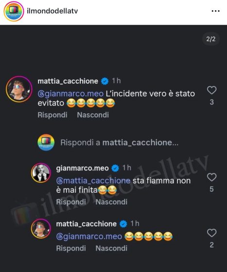 I due hanno avuto modo di conoscersi durante il programma e a quanto pare sono rimasti ancora oggi in contatto, dal momento che Mattia ha commentato il post di Gianmarco in cui parlava di un incidente d’auto in modo sarcastico, alludendo al rapporto con Francesca “l’incidente vero è stato evitato”, ha scritto l’ex corteggiatrice. Meo allora ha rincarato la dose “sta fiamma non è mai finita”, ha replicato riferendosi alla storia tra la Sorrentino e Maura.