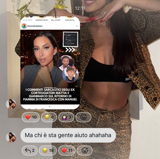 Il post è stato repostato su Instagram da varie pagine e riportando dalla stessa Francesca nel suo canale broadcast, in cui ha risposto piccata ai commenti degli ex corteggiatori: “ma chi è sta gente aiuto ahahahah”, ha scritto rivolta ai suoi followers più stretti.