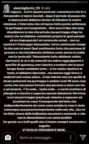 È giunta al capolinea la relazione tra Alex Migliorini e Alessandro D’Amico! A comunicarlo, pochi minuti fa, è stato l’ex tronista veronese sul suo profilo Instagram: