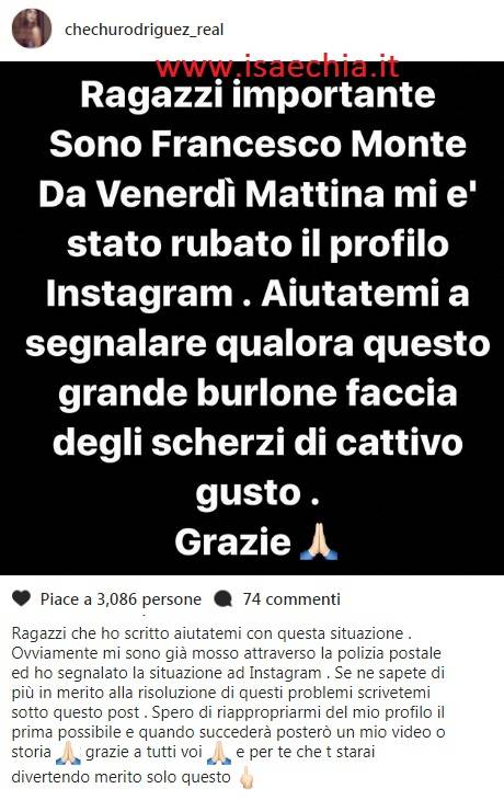 E mentre la bella argentina – in coppia con il fratello Jeremias – è impegnata nel reality show di Canale 5, l’ex tronista in queste ore sta vivendo una piccola disavventura: al bel Francesco, infatti, hanno hackerato il profilo Instagram e tramite la pagina di Chechu ha avvertito i numerosi follower…