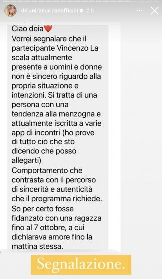 Ciao Deia. Vorrei segnalare che Vincenzo La Scala attualmente presente a Uomini e Donne non è sincero riguardo alla propria situazione e alle proprie intenzioni. Si tratta di una persona tendente alla menzogna e attualmente iscritta a varie app di incontri. Ho prove di tutto ciò. Comportamento che contrasta con il percorso di sincerità e autenticità che il programma richiede. So per certo che fosse fidanzato con una ragazza fino al 7 ottobre, a cui dichiarava amore fino alla mattina stessa.