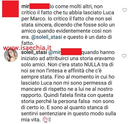 Dopo la scelta avvenuta l’11 maggio scorso sotto le telecamere di Uomini e Donne, Soleil e Luca sembravano affiatatissimi, e quando l’ex tronista ha varcato la porta rossa del Grande Fratello Vip 2, la bionda italo-americana è apparsa più volte nel salotto di Pomeriggio 5 da Barbara D’urso per sostenerlo in questa nuova avventura. Poco dopo, però, è avvenuto il colpo di scena: infatti, mentre lo studente di Odontoiatria era del tutto inconsapevole di quello che avveniva al di fuori, la Sorge ha iniziato a frequentare il “rivale” di Luca, ossia l’ex tronista Marco Cartasegna.