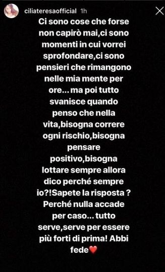 Ad oggi non si conoscono i reali motivi di questa crisi coniugale che ha colpito i TereSavvo, nelle scorse ore ci ha pensato l’ex tronista a far intendere di star attraversando un momento di profondo sconforto. Oltre a ringraziare i fan per i numerosi messaggi di affetto che sta ricevendo (il video in apertura di post), ha condiviso queste parole tramite una Instagram Stories: “Ci sono cose che forse non capirò mai. Ci sono momenti in cui vorrei sprofondare, ci sono pensieri che rimangono nella mia mente per ore… ma poi tutto svanisce quando penso che nella vita bisogna correre ogni rischio, bisogna pensare positivo, bisogna lottare sempre. Allora dico, perché sempre io? Sapete la risposta? Perché nulla accade per caso… tutto serve, serve per essere più forti di prima! Abbi fede“