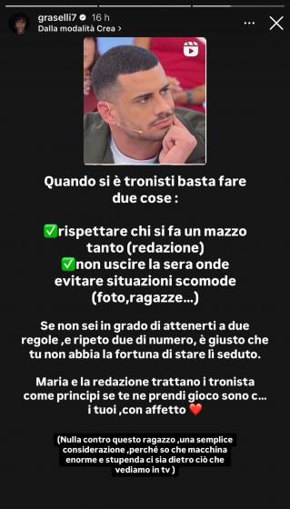 Quando si è tronisti basta fare due cose: rispettare chi si fa un mazzo tanto (redazione), non uscire la sera per evitare situazioni scomode (foto, ragazze…). Se non sei in grado di attenerti a due regole, ripeto a due di numero, è giusto che tu non abbia la fortuna di stare lì seduto. Maria e la redazione trattano i tronisti come i principi, se te ne prendi gioco sono c***i tuoi. Nulla contro questo di ragazzo, una semplice considerazione, perché so che macchina enorme e stupenda ci sia dietro ciò che vediamo in tv.