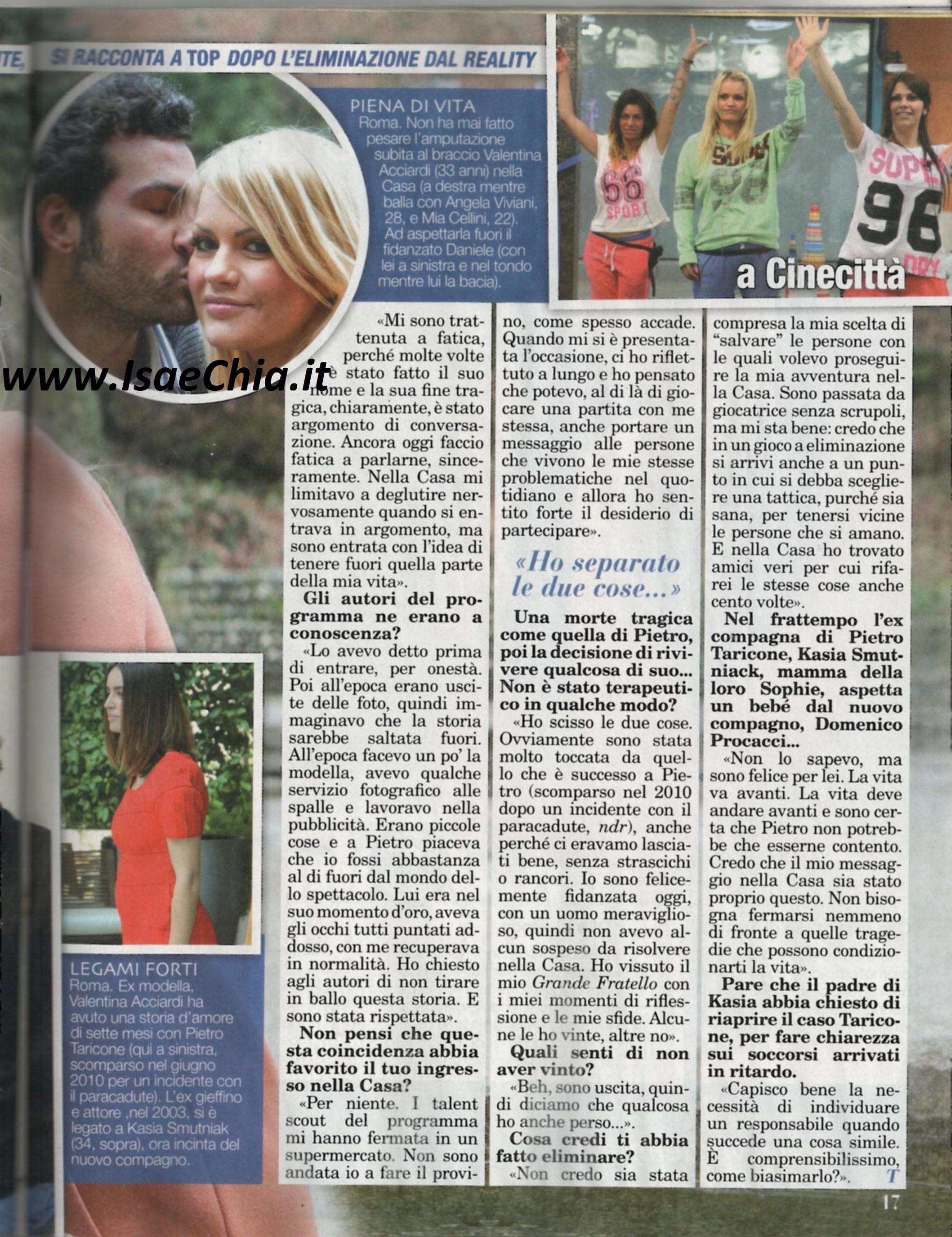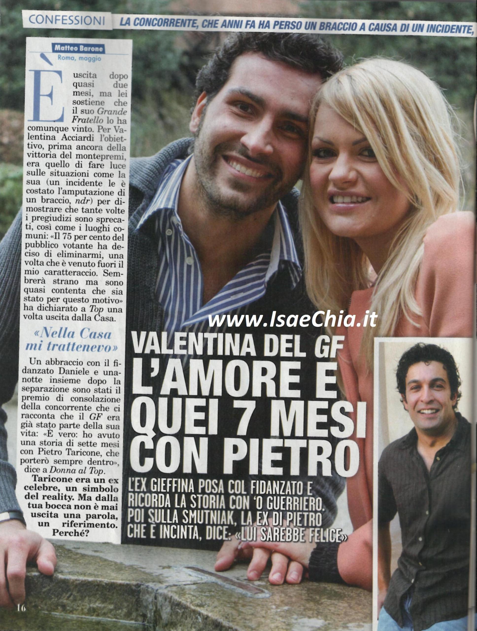 Qualche puntata fa, Valentina Acciardi ha lasciato la Casa del Grande fratello ed è tornata dal suo fidanzato Daniele. Ma prima di lui, qualche anno fa, ha avuto una storia con Pietro Taricone, concorrente della prima edizione del reality, scomparso in un tragico incidente: “Mi sono trattenuta a fatica dal nominarlo, perché molte volte è stato fatto il suo nome e la sua tragica morte è stata argomento di discussione. Nella Casa deglutivo nervosamente quando veniva fuori l’argomento, ma sono entrata con l’idea di tenere fuori quella parte della mia vita. Agli autori lo avevo detto prima di entrare, per onestà. Poi all’epoca erano uscite delle foto, quindi immaginavo che sarebbe saltato fuori: allora facevo la modella, lavoravo nelle pubblicità. Lui era nel momento d’oro, aveva tutti gli occhi puntati addosso ma con me recuperava in normalità. Ho chiesto agli autori di non tirare fuori questa storia e la mia scelta è stata rispettata. Non penso che questa coincidenza abbia favorito il mio ingresso nella Casa: i talent scout mi hanno fermata al supermercato, non sono andata io a fare il provino, come spesso accade. Quando mi si è presentata l’occasione, ho pensato che potevo giocare una partita con me stessa e dare un messaggio alle persone che vivono le mie stesse problematiche. Non ho vissuto il GF come qualcosa che aveva già vissuto Pietro: ho scisso le due cose. Oggi sono fidanzata con un uomo meraviglioso, quindi non avevo nessun sospeso da risolvere nella Casa. Ho vissuto il mio Grande fratello e ho perso le mie sfide: credo che non sia stata compresa da casa la mia scelta di salvare le persone con le quali volevo proseguire l’avventura. Sono passata per giocatrice senza scrupoli, ma mi va bene: a un certo punto del gioco bisogna scegliersi una tattica, purché sia sana, per tenersi vicine le persone che si amano. Nella Casa ho trovato amici veri e rifarei la stessa cosa cento volte”.