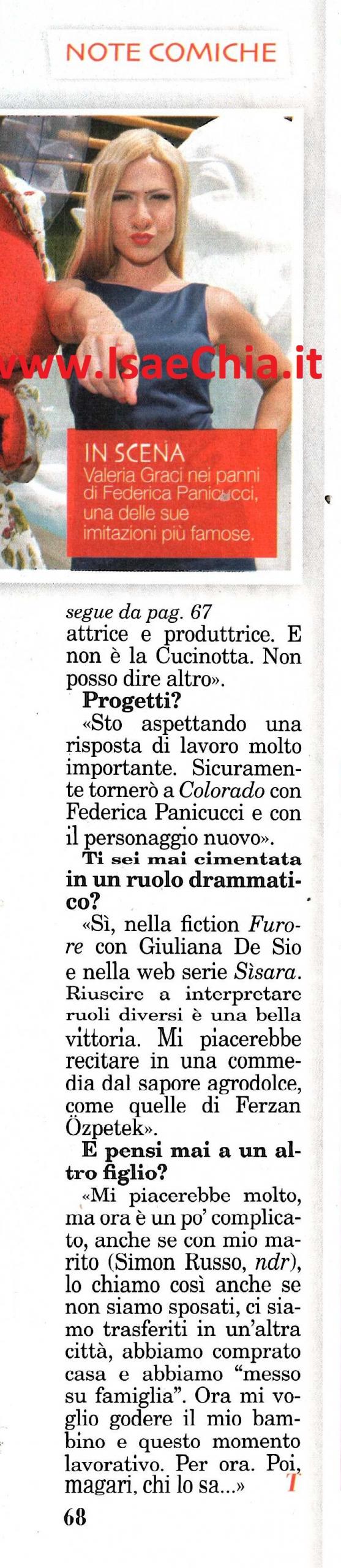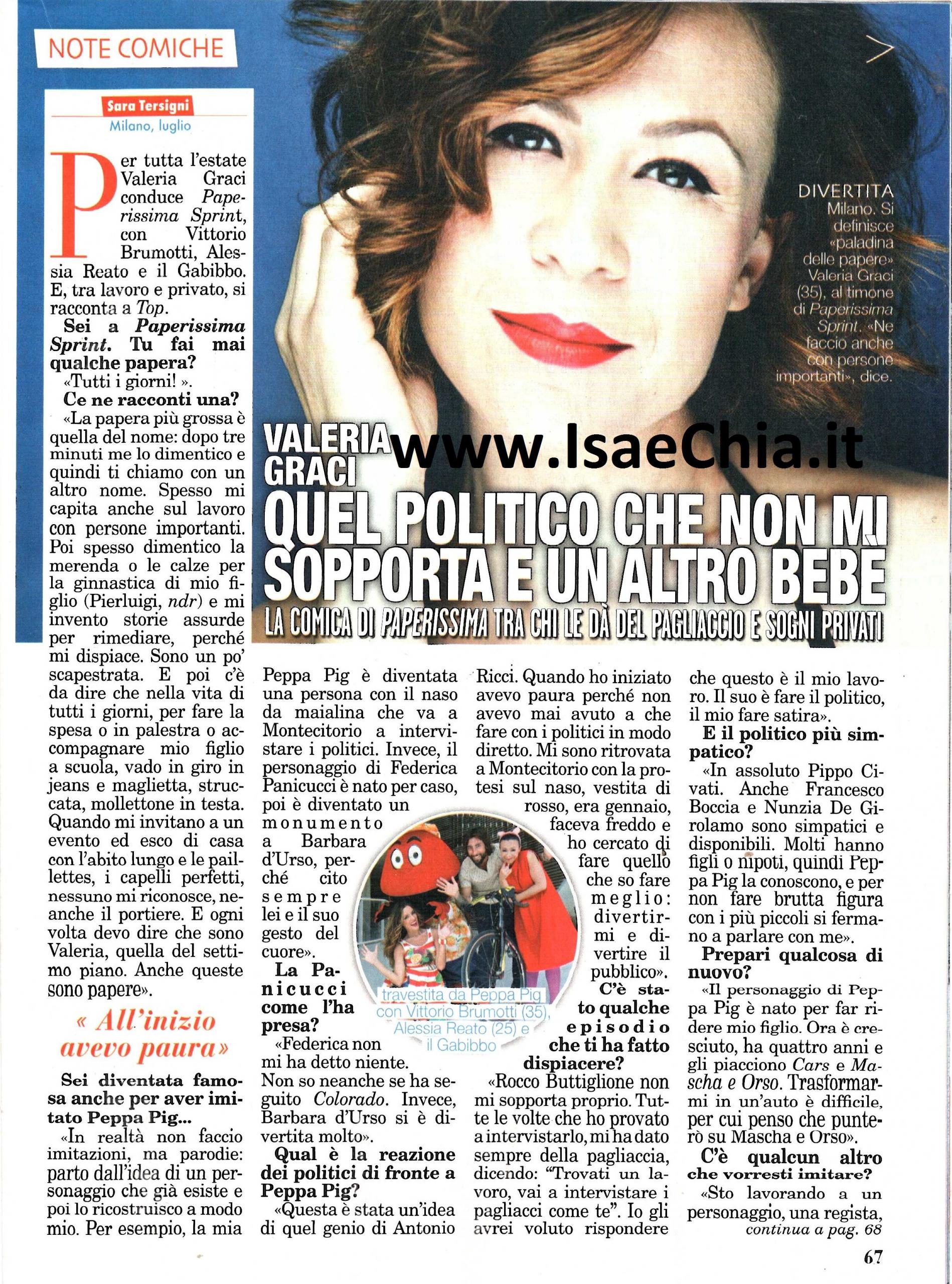 La grande novità di Paperissima Sprint quest’anno è l’arrivo di Valeria Graci, che interpreta il personaggio di Peppia Pig. Quando le si chiede se le capita mai di fare delle papere, la comica rivela: “Sempre! La papera più grossa è quella del nome: dopo tre minuti me lo dimentico e ti chiamo con un altro nome e mi capita anche con persone importanti, sul lavoro! Poi spesso dimentico le calze per la ginnastica o la merenda per mio figlio e invento storie assurde. Poi sono sempre in giro struccata e col mollettone; quando esco con abito lungo e i capelli perfetti, il portiere non mi riconosce e devo ricordargli che sono Valeria, quella del settimo piano. Anche queste sono papere!“. Parlando invece dei suoi personaggi più riusciti, Federica Panicucci e Peppia Pig, Valeria rivela: “In realtà non sono imitazioni, ma parodie: parto da un personaggio che già esiste e poi lo rielaboro a modo mio. Ad esempio, la mia Panicucci è diventato un monumento a Barbara D’Urso perché come lei fa il gesto del cuore. La Panicucci non mi ha detto niente, non so neanche se abbia seguito Colorado. So invece che Barbara si è divertita molto. L’idea di mandare Peppia Pig a disturbare i politici a Montecitorio è di Antonio Ricci. Quando ho iniziato avevo paura, perché non ho mai avuto a che fare con i politici! Rocco Buttiglione non mi sopporta proprio. Tutte le volte che ho provato ad intervistarlo, mi ha dato della pagliaccia, dicendomi: ‘Trovati un lavoro, vai ad intervistare i pagliacci come te’. Io gli avrei voluto rispondere che questo è il mio lavoro. Il suo è fare politica, il mio è fare satira. Il più simpatico? In assoluto Pippo Civati, ma anche Francesco Boccia e Nunzia De Girolamo. Molti hanno figli e nipoti, quindi per non fare brutta figura con i piccoli, si fermano a parlare con me. Il personaggio di Peppia Pig è nato per far ridere mio figlio. Gli piacciono anche Cars e Masha e Orso. Trasformarmi in un’auto è un po’ difficile, quindi credo che ora punterò su Masha e Orso! Sto preparando anche un altro personaggio: è una regista, attrice e produttrice e non è Maria Grazia Cucinotta. Sicuramente a Colorado tornerò con un personaggio nuovo. Ma in passato ho interpretato anche ruoli drammatici, come nella fiction Furore, con Giuliana De Sio: riuscire ad interpretare ruoli diversi è una bella vittoria. Mi piacerebbe recitare in una commedia agrodolce, come quelle di Ferzan Ozpetek“. Infine, quando le si chiede se pensa ad un secondo figlio, risponde: “Mi piacerebbe, ma ora è un po’ complicato, anche se con mio marito Simon Russo (che io chiamo ‘marito’ anche se non siamo sposati), ci siamo trasferiti, abbiamo preso casa e abbiamo “messo su famiglia”. Per ora mi voglio godere questo momento e mio figlio. Per il futuro…Chissà!“.