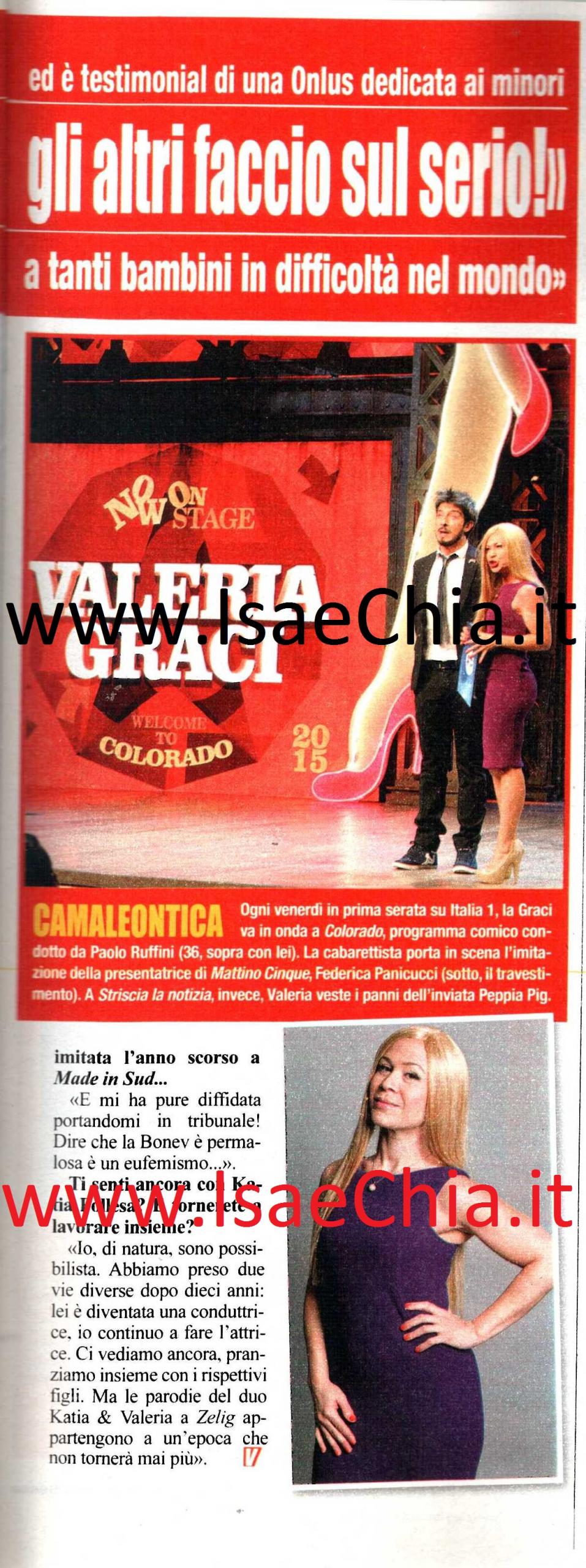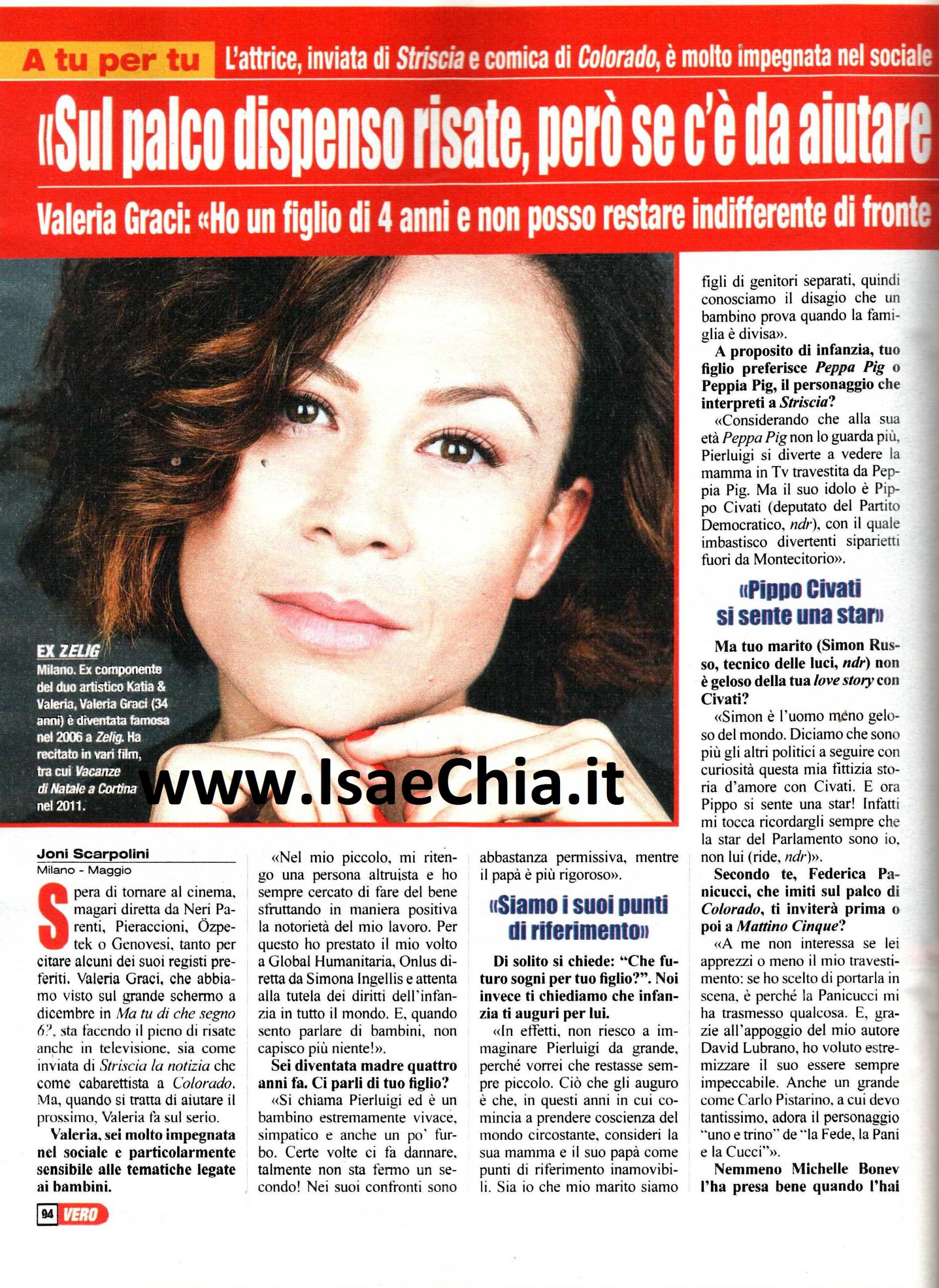 A Colorado ci fa ridere con la sua imitazione di Federica Panicucci e al cinema è stata protagonista della commedia Ma tu di che segno 6?. Ma quando si tratta di aiutare il prossimo, Valeria Graci, ex componente del duo comico Katia e Valeria, sa fare anche sul serio. Intervistata, l’attrice rivela di essere molto impegnata nel sociale e sensibile alle tematiche legate ai bambini: “Nel mio piccolo mi ritengo una persona altruista e ho sempre cercato di fare del bene sfruttando in modo positivo la notorietà data dal mio lavoro. Ho prestato il mio volto a Global Humanitaria, una Onlus attenta ai diritti dell’infanzia in tutto il mondo“. Quando sente di parlare di bambini, infatti, Valeria, che è diventata mamma quattro anni fa, non capisce più niente: “Mio figlio si chiama Pierluigi ed è estremamente vivace, simpatico e un po’ furbo. Ci fa dannare, non sta fermo un secondo! Nei suoi confronti sono abbastanza permissiva, mentre il papà è più rigoroso. Non riesco ancora ad immaginarlo da grande, vorrei che restasse sempre piccolo. Ciò che gli auguro è che, in questi anni in cui comincia a prendere cosicenza del mondo circostante, consideri la mamma e il papà come punti di riferimento inamovibili. Sia io che mio marito siamo figli di genitori separati e conosciamo il disagio che un bambino prova quando la famiglia è divisa“. Parlando invece in toni meno seri, quando le si chiede cosa ne pensa il figlio di Peppia Pig, il personaggio che Valeria interpreta a Striscia la notizia, lei risponde: “Non guarda più Peppa Pig, ma si diverte a vedere la mamma travestita da Peppia. Il suo idolo è il deputato Pippo Civati, con cui imbastisco dei divertenti siparietti fuori da Montecitorio. Mio marito Simon, invece, è l’uomo meno geloso del mondo!“. Quando le si chiede invece se crede che prima o poi la Panicucci la inviterà a Mattino Cinque, l’imitatrice risponde: “A me non interessa se lei apprezzi o meno il mio travestimento. Se ho scelto di portarla in scena è perché la Panicucci mi ha trasmesso qualcosa. E grazie all’appoggio del mio autore David Lubrano, ho voluto estremizzare il suo essere sempre impeccabile. Michelle Bonev, che ho imitato l’anno scorso a Made in Sud, mi ha diffidata portandomi in tribunale. Dire che sia permalosa è un eufemismo!“. Infine, quando le si chiede se sente ancora Katia Follesa e crede che torneranno a lavorare insieme, risponde: “Io, di natura, sono possibilista. Abbiamo preso vie diverse dopo dieci anni: lei è diventata conduttrice, io attrice. Ci vediamo ancora, pranziamo con i figli, ma le parodie del duo di Zelig appartengono a un’epoca che non tornerà più“.