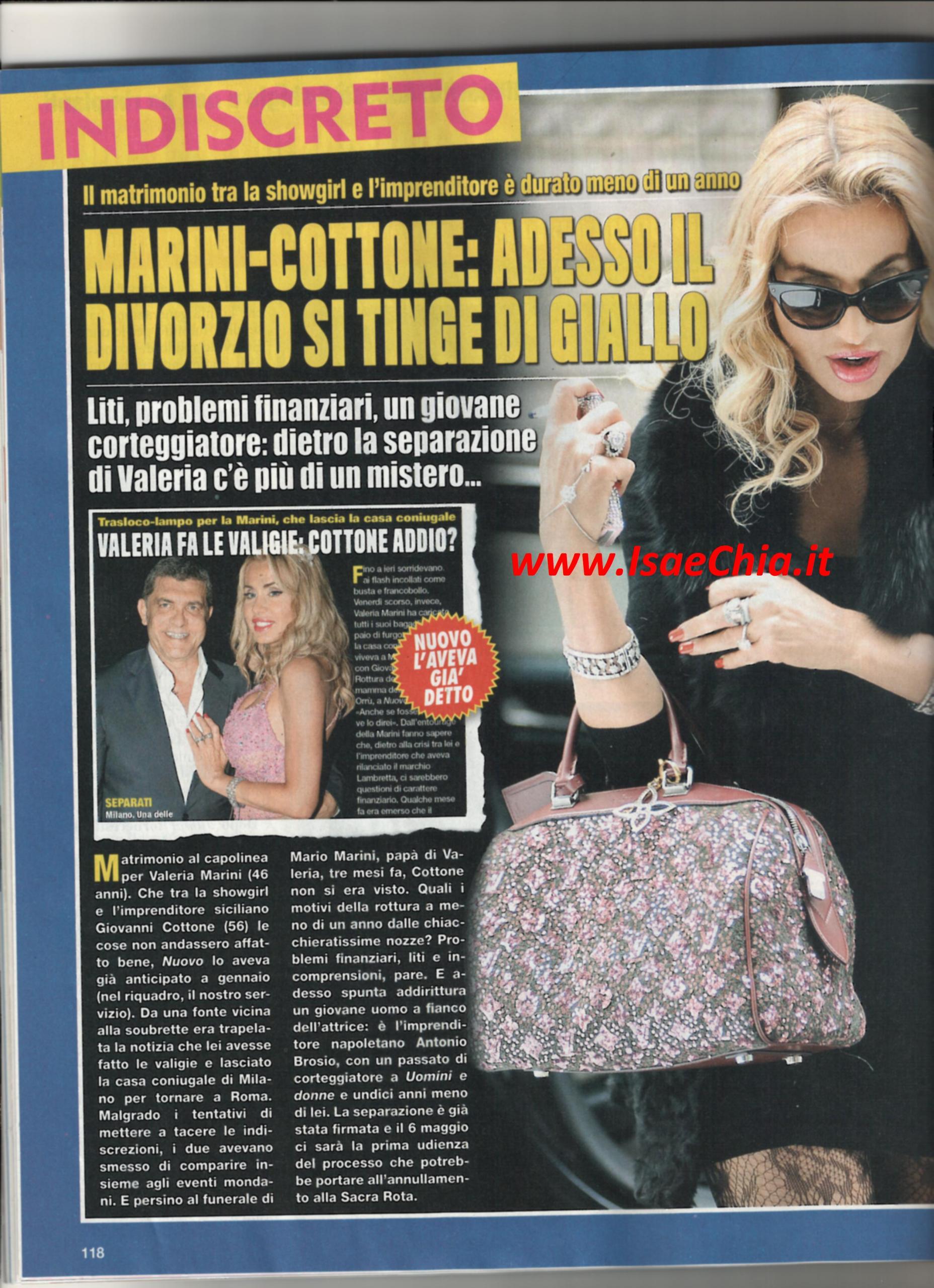 La notizia della rottura tra Valeria Marini e Giovanni Cottone, unitisi in matrimonio il 5 maggio dell’anno scorso, era stata già anticipata da Nuovo, che da fonti vicine all’ex naufraga aveva saputo che lei aveva fatto già le valigie e aveva abbandonato il tetto coniugale di Milano per tornare a vivere a Roma. Nonostante i tentativi di mettere a tacere le indiscrezioni, i due avevano smesso di comparire insieme ad eventi mondani: persino al funerale del padre della Marini, Cottone non si era visto. I motivi della separazione non sono ancora certi: problemi finanziari, liti e incomprensioni, pare. Adesso, però, spunta un nuovo, giovane uomo al fianco di Valeria, l’imprenditore napoletano Antonio Brosio, con un passato da corteggiatore a Uomini e donne e di ben 11 anni più giovane di lei. La separazione è stata già firmata e il 6 maggio ci sarà la prima udienza del processo che potrebbe far annullare il matrimonio dalla Sacra Rota.