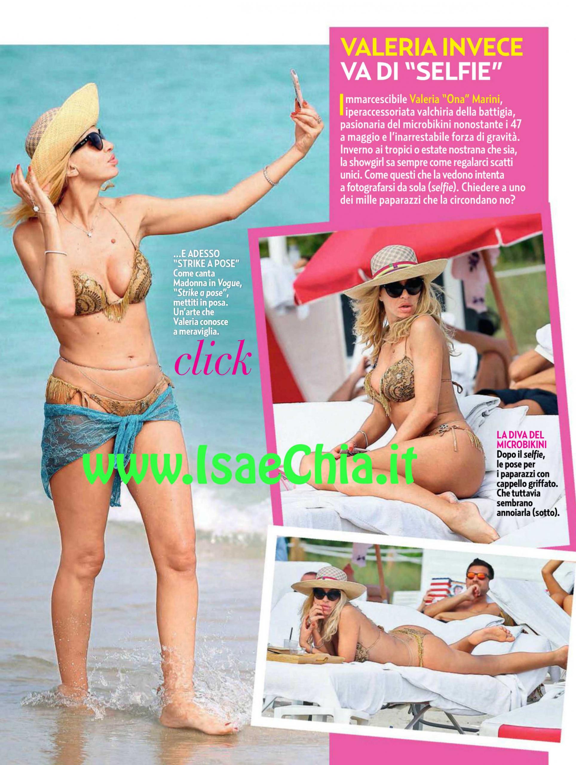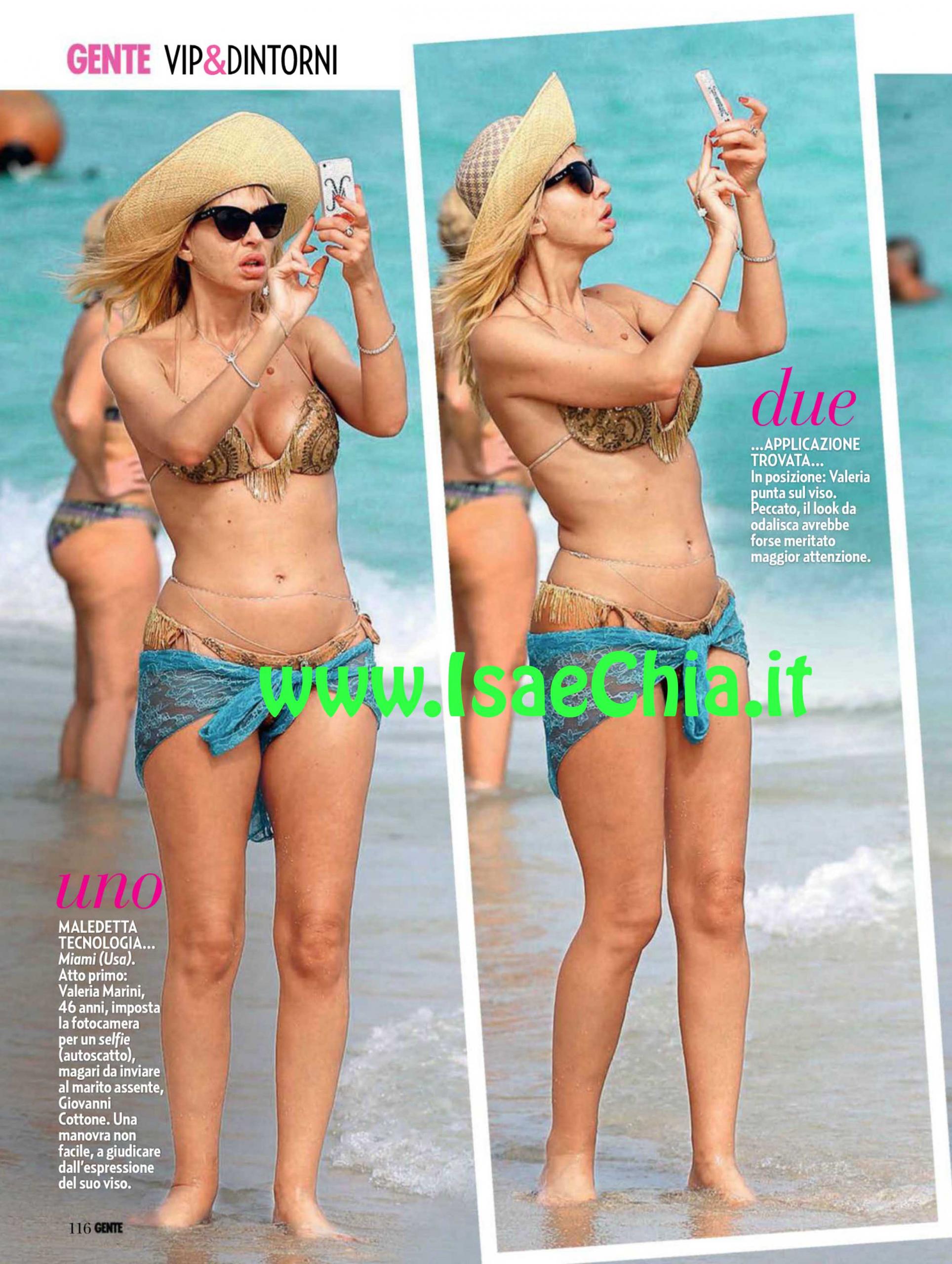 Nonostante compia 47 anni a maggio e l’inarrestabile forza di gravità, l’ex naufraga Valeria Marini sfoggia un bel microbikini. Sulle spiagge di Miami, la showgirl imposta la fotocamera per una selfie (autoscatto), magari da inviare al marito assente Giovanni Cottone. Una manovra non facile, a giudicare dall’espressione sul suo viso. Alla fine opta per uno scatto al viso, nonostante il suo costume da odalisca. Non sarebbe stato meglio chiederne una ai tanti paparazzi presenti?