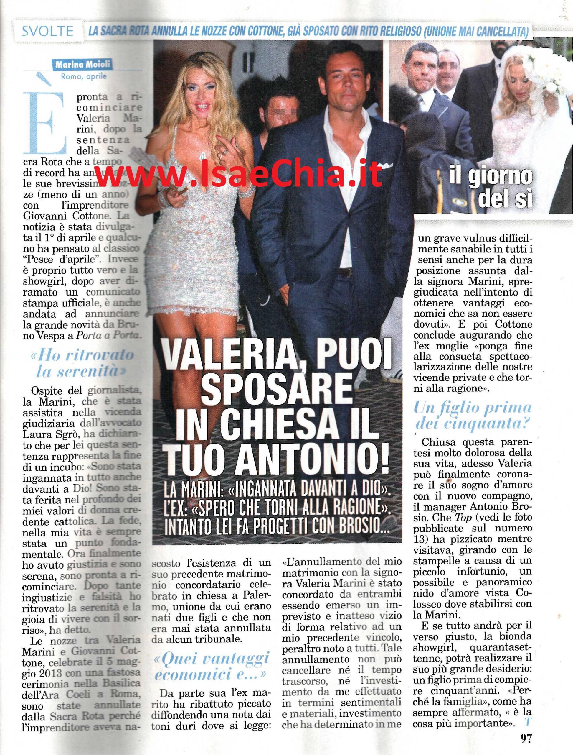 La notizia è ufficiale: il matrimonio celebrato tra Valeria Marini e Giovanni Cottone è stato annullato dalla Sacra Rota. I due si erano sposati il 5 maggio di due anni fa, con una fastosissima cerimonia, ma meno di un anno dopo hanno dato la notizia della loro separazione. In realtà, il matrimonio non sarebbe valido, poiché l’imprenditore siciliano era già sposato con un’altra donna e l’aveva tenuto nascosto alla showgirl sarda. “Cottone aveva nascosto alla Marini il suo precedente matrimonio celebrato in chiesa, con un’altra donna, a Palermo, da cui sono nati due figli e che non è mai stato annullato da nessun tribunale. Dinanzi alla precisa ricostruzione dei fatti, Cottone non ha potuto eccepire nulla” ha dichiarato l’ufficio stampa di lei. Lui, dal suo canto, non ha rilasciato interviste e la sua unica dichiarazione a riguardo è stata: “L’annullamento del mio matrimonio con la signora Marini è stato concordato da entrambi, essendo emerso un imprevisto ed inatteso vizio di forma relativo ad un mio precedente vincolo, peraltro noto a tutti“. L’ex naufraga dell’Isola dei famosi ha commentato così: “Ero a conoscenza di un matrimonio civile celebrato da Cottone, ma non sapevo nulla di queste precedenti nozze! Sono stata ingannata anche davanti a Dio! Sono stata ferita nel profondo nei miei valori di donna credente e cattolica. Ora finalmente ho avuto giustizia e sono serena, sono pronta a ricominciare“. Anche il “prete dei vip”, don Santino Spartà, non si spiega come mai nessuno non si sia accorto prima di questa bigamia: “Mi sembra davvero molto strano. Ci sono i certificati di stato civile e religioso che attestano la situazione personale degli sposi. Se hanno avuto precedenti matrimoni, se sono stati battezzati e cresimati. Una volta celebrato il matrimonio, il parroco, pena la galera, deve trasmettere l’atto di matrimonio al Comune in cui è avvenuto. La procedura è molto precisa, trovo incredibile aver commesso un errore simile“. Con la fine di questo matrimonio, inoltre, sembrava sfumato anche il sogno di Valeria di diventare mamma. “Ho dovuto prendere atto di aver fatto valutazioni sbagliate, ma in questo periodo mi ha aiutato la fede e credo ancora nell’amore” dichiarava lei. E infatti, poco dopo l’abbiamo ritrovata felice al fianco dell’ex corteggiatore Antonio Brosio. Quest’ultimo, smentendo una loro crisi, ultimamente ha persino dichiarato di voler sposare Valeria (QUI per rivedere il post). Secondo altre fonti, invece, i due si sarebbero lasciati nonostante queste grandi premesse. Come finirà questa telenovela?