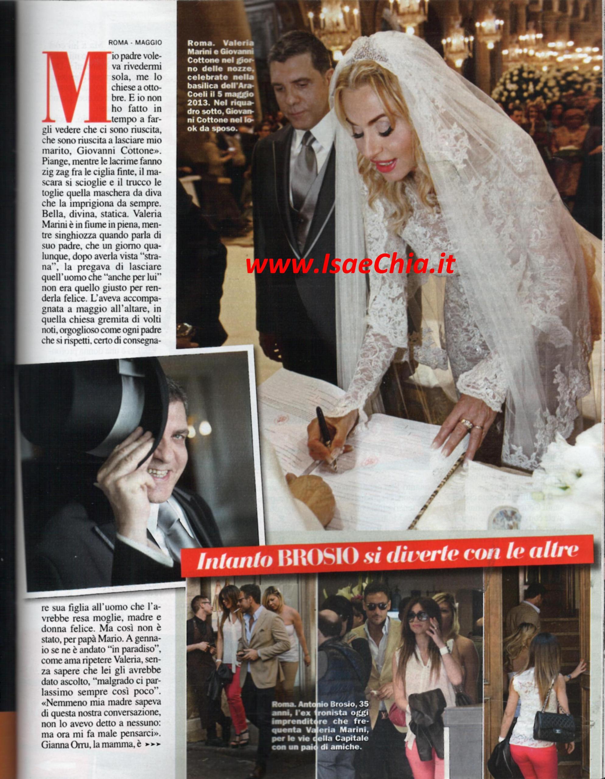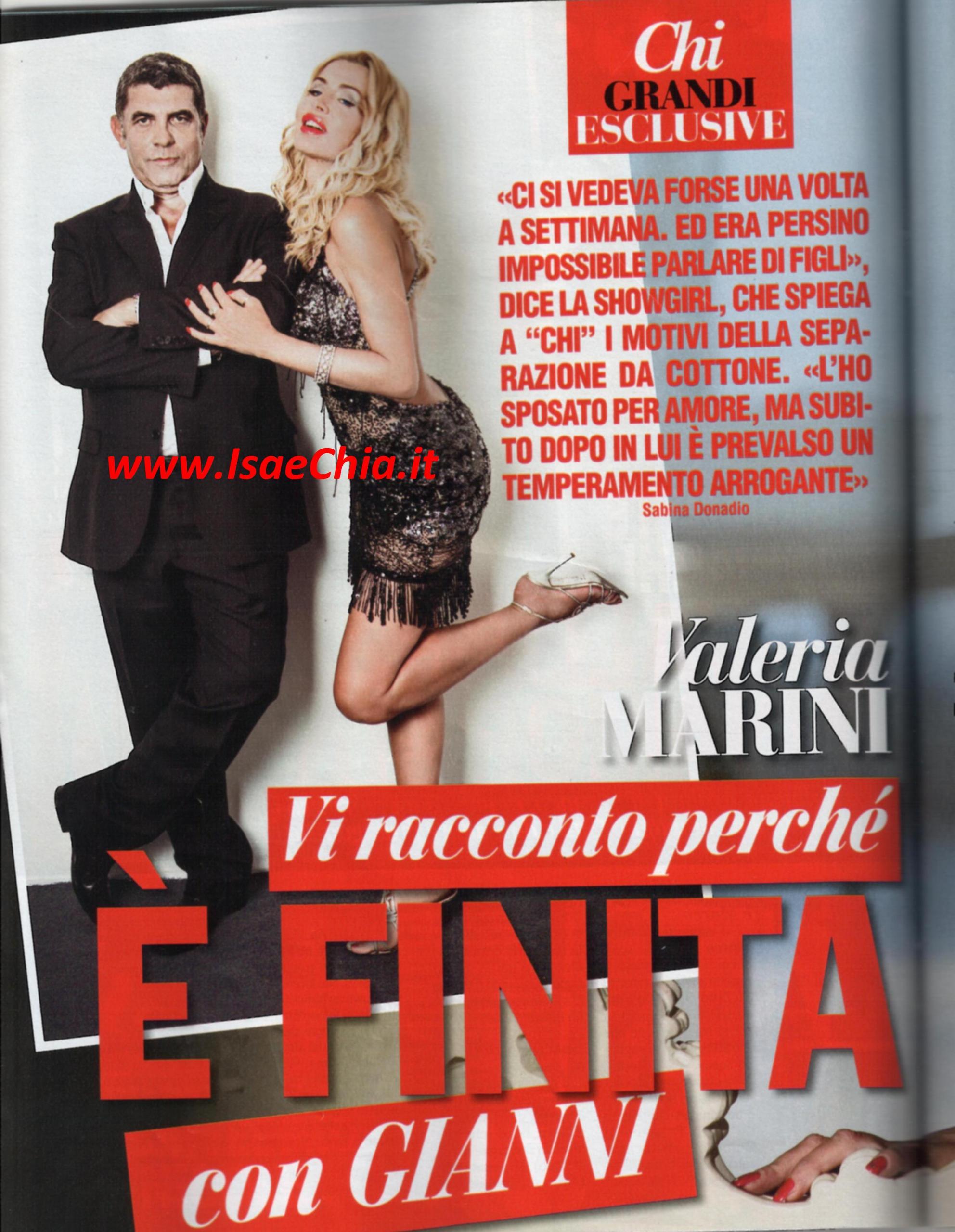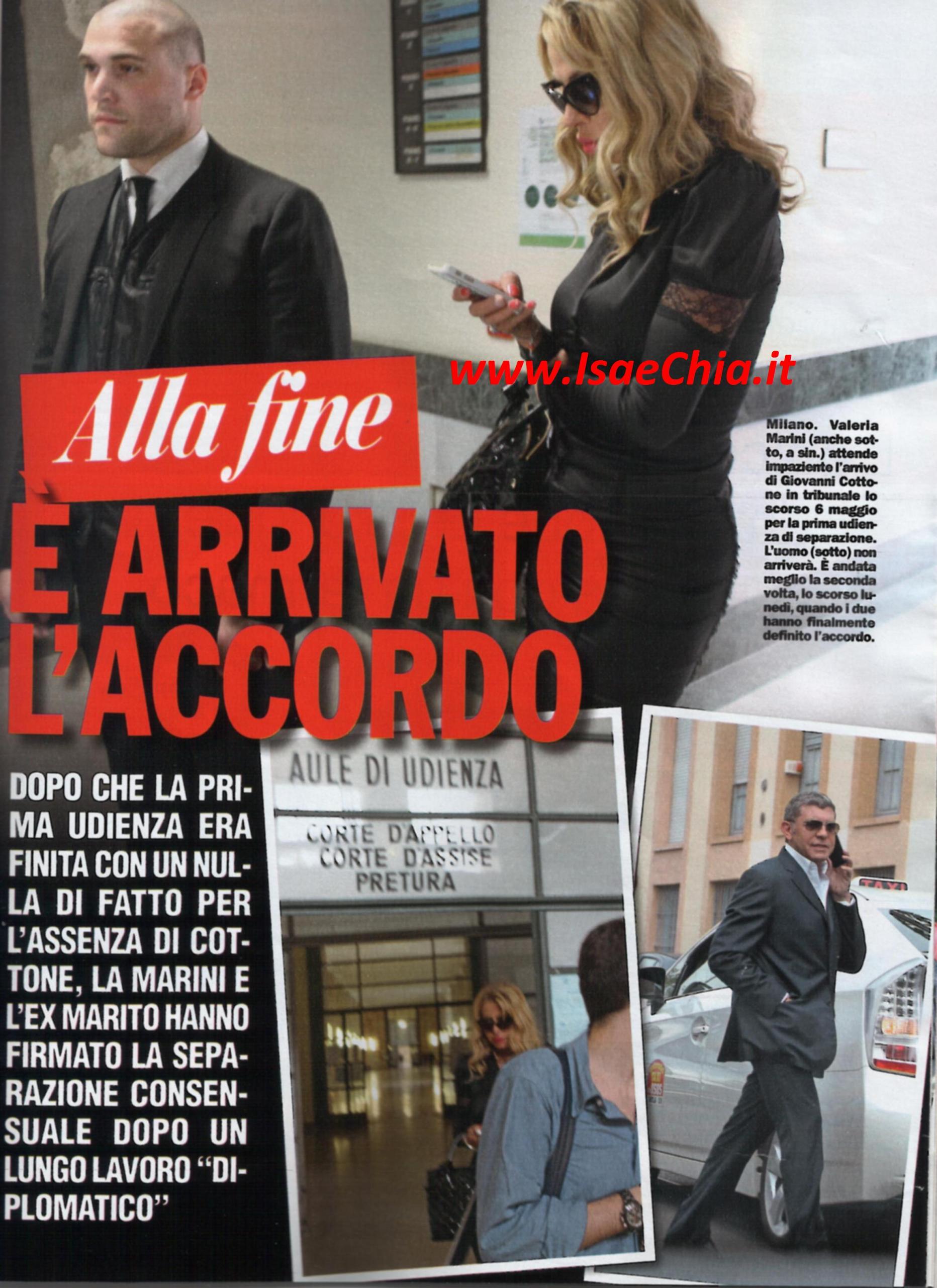 A meno di un anno dalla celebrazione delle nozze, l’ex naufraga Valeria Marini e l’imprenditore Giovanni Cottone hanno chiesto la separazione o addirittura l’annullamento. Un evento avvolto nel mistero, che ha dato adito a molte ipotesi, voci e supposizioni. Adesso, però, la showgirl di origini sarde ha deciso di svelarne i motivi: “Mio padre voleva rivedermi sola. Me lo chiese ad ottobre, quando mi vide “strana”: anche per lui, Gianni non era l’uomo giusto. E io non ho fatto in tempo a fargli vedere che ci sono riuscita” racconta lei tra le lacrime. Quando le si fa notare che lui ha dichiarato di averla amata e di amarla ancora, lei risponde: “Dice lui. Di certo mi ha voluta con ostinazione: ci siamo conosciuti ad una festa e da allora ha continuato a dichiararmi amore eterno e mi ha chiesto di sposarlo. E poi, dopo il matrimonio, Gianni cambia. Mi rendo conto che posso apparire ridicola, ma è così. La delusione mi cresceva dentro, rendendomi sempre più confusa. L’espressione “matrimonio non consumato” che ho usato non si riferisce ad un rapporto fisico, ma ad un’incolmabile distanza affettiva”. Quando le si chiede se aveva fatto un giretto su Google per informarsi sul passato di Cottone, risponde: “Lui mi diceva che erano tutte calunnie, che ci voleva solo tempo per mettere tutto a posto, che i suoi legali ci stavano lavorando. E’ la persona che hai davanti che deve dirti chi è, non io a chiederlo”. Quando la giornalista le chiede quanto abbia giocato il suo desiderio di avere una famiglia e dei figli ad un’età non più tenerissima, la Marini risponde: “Moltissimo, ma di figli non c’era tempo per parlarne. Non vedevo mio marito. Quando lo vedevo si parlava di lavoro, con discussioni infinite. Il nervosismo, la distanza, un certo temperamento arrogante, hanno prevalso in lui. Per me la solitudine regnava: lui era sempre in viaggio e quando era a Roma restava spesso nella casa che aveva affittato al piano sotto la mia. In una settimana ci vedevamo forse una volta. Avevamo una concezione diversa del rapporto matrimoniale e a lui andava bene così. Io mi sono sposata davanti a Dio per credere in quel “per sempre”, ma da quel giorno non mi sono data più pace. La mia vita era tutta un “forse” e lui ha persino provato a scardinare i miei affetti sacri, come mia madre, mio fratello e mia sorella, nell’assurdo tentativo di isolarmi da tutto. Vorrei solo liberarmi da quest’ansia tremenda, girare pagina. Non meritavo il dolore che provo e sono bersaglio di facile ironia, il mio matrimonio è parso uno show. Ma di esso rimane un macchinario per i bambini del Gaslini di Genova e di ciò sono orgogliosa. A modo mio, continuerò a volergli bene e per lui ci sarò sempre. Sono fatta così e lui lo sa”.